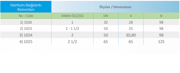 1 • 2-1 1/2 • 2 • 2 1/2 hortum bağlantı rekorları.